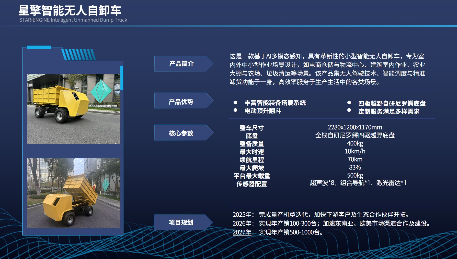 星擎無人自卸車是壹款基於AI多模態感知,具有革新性的小型智能無人自卸車,專為室內外中小型作業場景設計,如電商倉儲與物流中心、建築室內作業、農業大棚與農場、垃圾清運等場景。該產品集無人駕駛技術、智能調度與精準卸貨功能於壹身,高效率服務於生產生活中的各類場景。