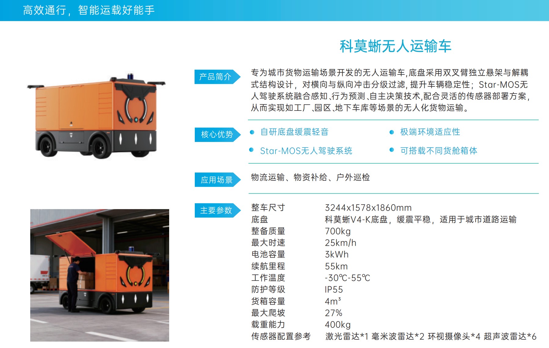 星馭智能存取車是壹款專為城市貨物運輸、移動存取櫃場景開發的智能無人鮋車,底盤采用雙叉臂獨立懸架與解耦式結構設計,對橫向與縱向沖擊分級過濾,提升車輛穩定性;Star-MOS無人駕駛系統融合感知、行為預測,自主決策技術,配合靈活的傳感器部署方案,從而實現如工業園區、景區,商業街、大學城等場景下的無人化貨物運輸與物品存取。