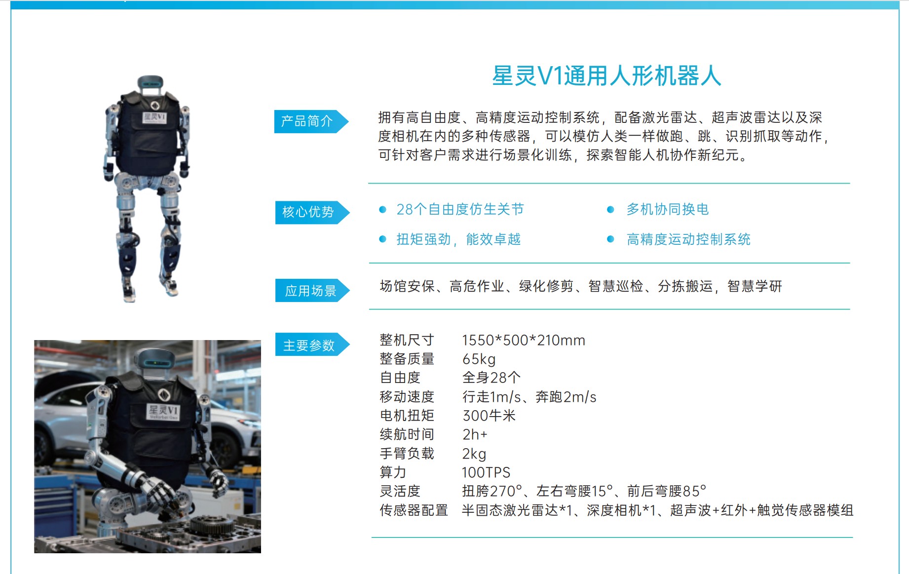 星靈V1人形機器人,是壹款主要面向制造業與服務場景的通用型人形機器人,具備類人尺寸與靈活運動能力,可廣泛應用於物料配送、自動化生產、場館安保、智慧巡檢、服務輔助等多種場景。